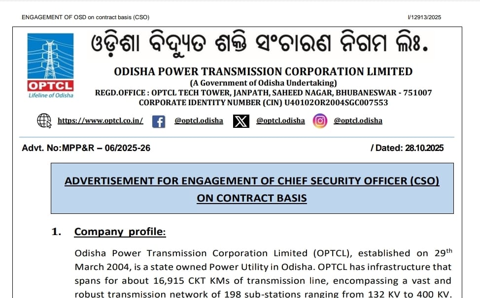 Odisha Power Transmission Corporation Limited (OPTCL) has released its 2026 recruitment notification for the post of Chief Security Officer (CSO). Candidates will receive a consolidated monthly remuneration of Rs. 35,000, and applicants must not exceed 63 years of age. Although the number of vacancies is not specified, applications must be submitted offline through Speed Post, Registered Post, or Courier Service. The last date to apply is 31 December 2025, and all eligible candidates are encouraged to carefully review all requirements before submitting their forms for further consideration.