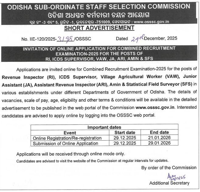 Odisha Sub-Ordinate Staff Selection Commission (OSSSC) has released a short notification for Combined Recruitment 2026.