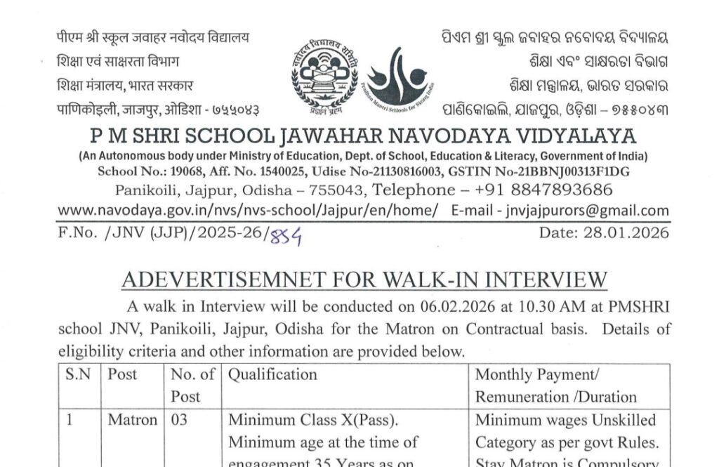 PM SHRI Jawahar Navodaya Vidyalaya Recruitment 2026 has been released by PM SHRI Jawahar Navodaya Vidyalaya, Jajpur. Eligible candidates from Odisha are invited to attend the recruitment process for the post of Matron. A total of 03 vacancies are available under Advertisement No. JNV (JJJP)/2025-26/84. Applicants should have passed at least Class X and must be between 35 to 55 years of age. Selected candidates will be paid minimum wages under the Unskilled Category as per Government rules. The selection will be conducted through an interview. Interested and eligible candidates should apply through offline mode and attend the walk-in interview on 06 February 2026. For more details, candidates are advised to visit the official website https://jajpur.odisha.gov.in/.