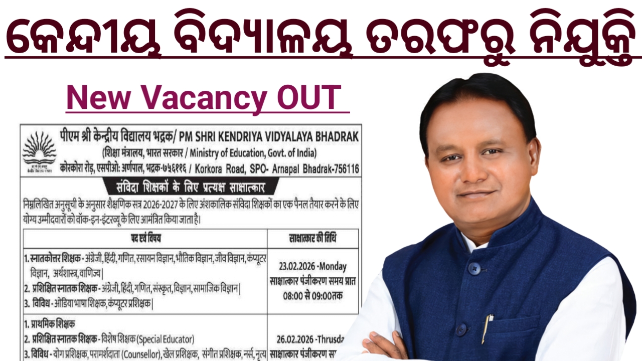 PM SHRI Kendriya Vidyalaya Bhadrak, under the Ministry of Education, Government of India, is conducting walk-in interviews to prepare a panel of part-time contractual teachers for the academic session 2026–27. The interviews will be held on 23rd February 2026 for PGT, TGT, and miscellaneous teaching posts, and on 26th February 2026 for Primary Teachers, Special Educators, and other vocational and activity-based instructors. Registration time is from 08:00 AM to 09:00 AM at the school campus. Eligible candidates must bring their original certificates, self-attested photocopies, and two recent passport-size photographs. All appointments will be purely on a contractual basis.