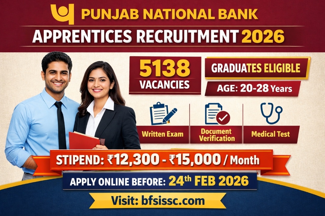 Punjab National Bank (PNB) has released the Apprentices Recruitment 2026 notification for 5138 vacancies across India. Candidates holding a graduate degree from a recognized university are eligible to apply. Applicants must be 20 to 28 years old as on 01 January 2026, with age relaxation applicable as per government norms. The selection process will include an online written test, followed by document verification, local language test (if applicable), and a medical examination. Selected apprentices will receive a monthly stipend ranging from ₹12,300 to ₹15,000, depending on the posting location. The online application process is open until 24 February 2026, and interested candidates can apply through the official website bfsissc.com.