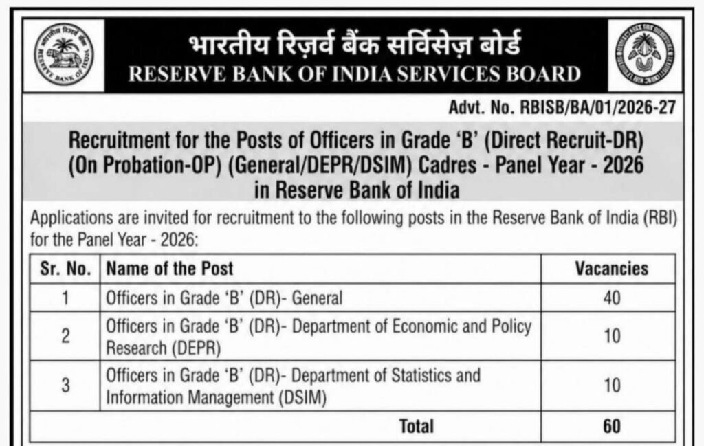 The Reserve Bank of India (RBI) has announced recruitment for Officer Grade B posts in 2026, offering 60 vacancies across India. Candidates with a Bachelor’s degree can apply for General, while DEPR requires a Master’s degree. Selection includes written exam, mains, interview, and merit list. Applications must be submitted online through the official website https://rbi.org.in/⁠ as per guidelines and eligibility criteria mentioned in the notification released.