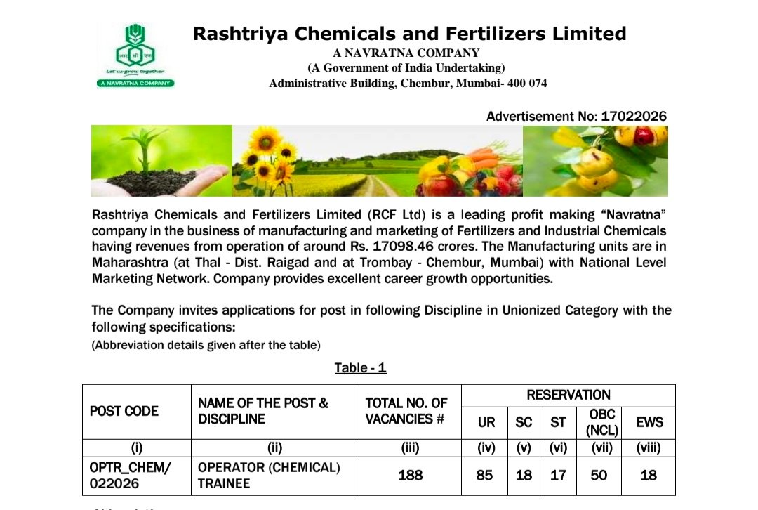 Rashtriya Chemicals and Fertilizers (RCFL) has announced the Operator (Chemical) Trainee Recruitment 2026 under Advt No. 17022026, offering a total of 188 vacancies for eligible candidates across India. Applicants must possess a B.Sc. or relevant degree to apply for this position. The recruitment will be conducted through an online application process, and selected candidates will receive a monthly salary of Rs. 22,000. While the minimum age limit and detailed selection process are to be confirmed through the official notification, interested candidates are advised to complete their applications before the last date, 27 April 2026. For complete eligibility criteria and updates, candidates should visit the official website of RCFL at https://www.rcfltd.com/
