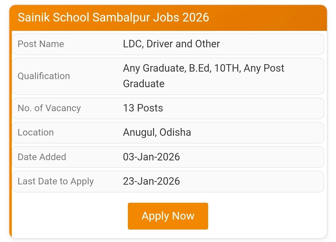 Sainik School Sambalpur, Odisha has released an official recruitment notification for 13 vacancies for various teaching and non-teaching posts including Lower Division Clerk (LDC), Upper Division Clerk (UDC), PGT (Biology, Maths, Computer Science), TGT (Social Science, General Science), Librarian, Driver, and Ward Boy. Interested candidates who have completed Matriculation, Graduation, Post-Graduation, and/or B.Ed as per post requirements are eligible to apply. The salary ranges from ₹19,900 to ₹75,000 per month, depending on the post. The age limit is between 18 and 50 years, varying by position. Eligible candidates must submit their applications on or before 23 January 2026. For detailed eligibility criteria, application procedure, and official notification, candidates are advised to visit the official website www.sainikschoolsambalpur.edu.in.