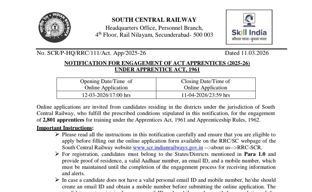 The South Central Railway (SCR), Railway Recruitment Cell, Secunderabad has released an official notification for 2801 Act Apprentice posts under the Apprentices Act, 1961. Candidates from across India who have completed 10th class and ITI can apply online.