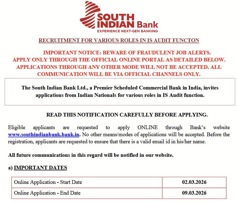 South Indian Bank has released a recruitment notification for Specialist Posts in 2026. The available positions include Vulnerability Assessment & Penetration Testing (VAPT) Scale II/III, IT General Controls (ITGC) Audit Scale I/II, and Red Team Lead Scale I/II. Candidates applying for these posts must not exceed 35 years of age as on 31.01.2026. Applicants should possess a B.Tech/B.E./B.Sc degree in Computer Science, Information Technology, or Electronics & Communication with a minimum of 50% marks along with relevant work experience. The selected candidates will receive IBA-approved Scale I/II/III pay along with applicable allowances and performance-linked incentives. The selection process will be based on shortlisting followed by a personal interview. There is no application fee for these posts, and the job location will be anywhere in India. Interested candidates can apply online through the official website before the last date, 09 March 2026.