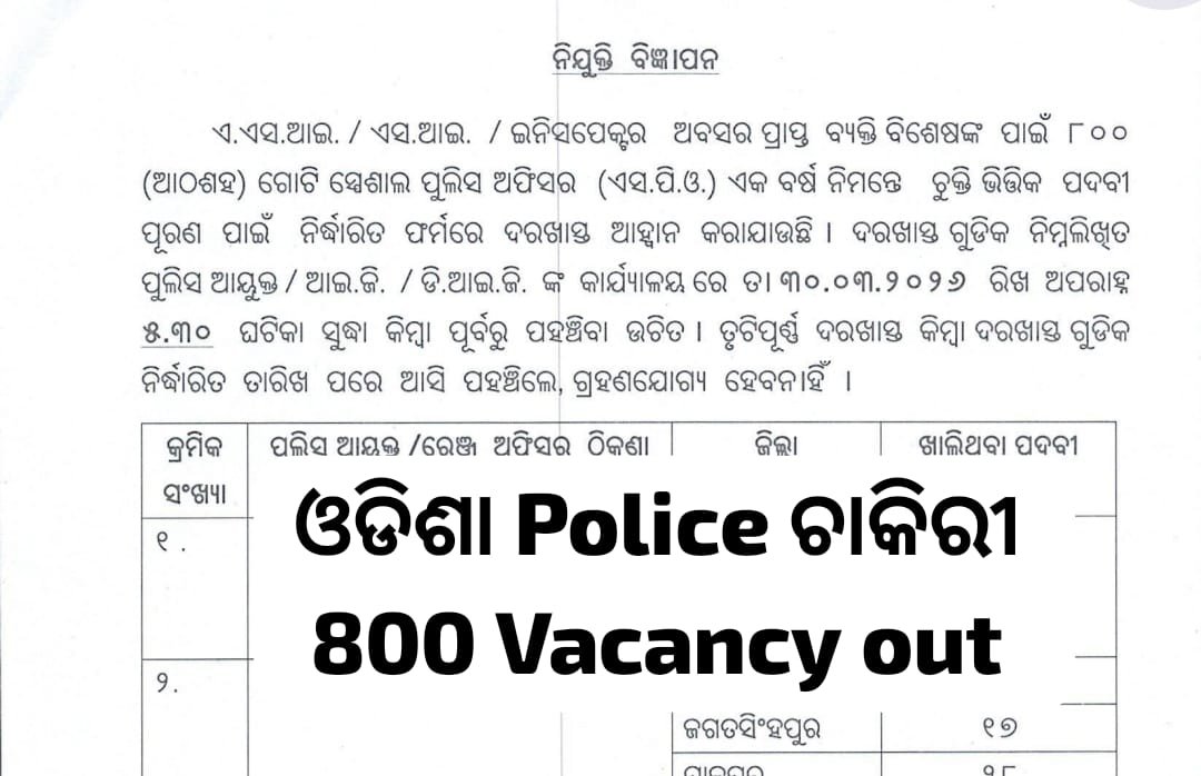 Odisha Police has released a recruitment notification for 800 Special Police Officer (SPO) posts for the year 2026. This recruitment is open to retired Assistant Sub-Inspectors, Sub-Inspectors, and Inspectors of Police who are residents of Odisha. Selected candidates will be appointed on a contract basis, and the salary will be provided as per the Government of Odisha Finance Department Memo No.24533/F dated 22.09.2022. Applicants must be 65 years or below to be eligible for the post. Interested candidates need to apply through offline mode before the last date of 30 March 2026. The detailed selection process and other instructions are available in the official notification on the Odisha Police website at https://police.odisha.gov.in/.