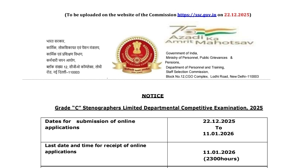 The Staff Selection Commission (SSC) has released a notification for the recruitment of 326 Grade “C” Stenographers through the Limited Departmental Competitive Examination (LDCE), 2025. This recruitment is open to eligible Stenographer Grade “D” employees from Odisha. Selected candidates will receive salary and service benefits as per existing service/cadre rules. The detailed selection process is provided in the official notification. Interested and eligible candidates must submit their applications online through the official SSC website https://ssc.gov.in on or before 11 January 2026 (up to 2300 hours).