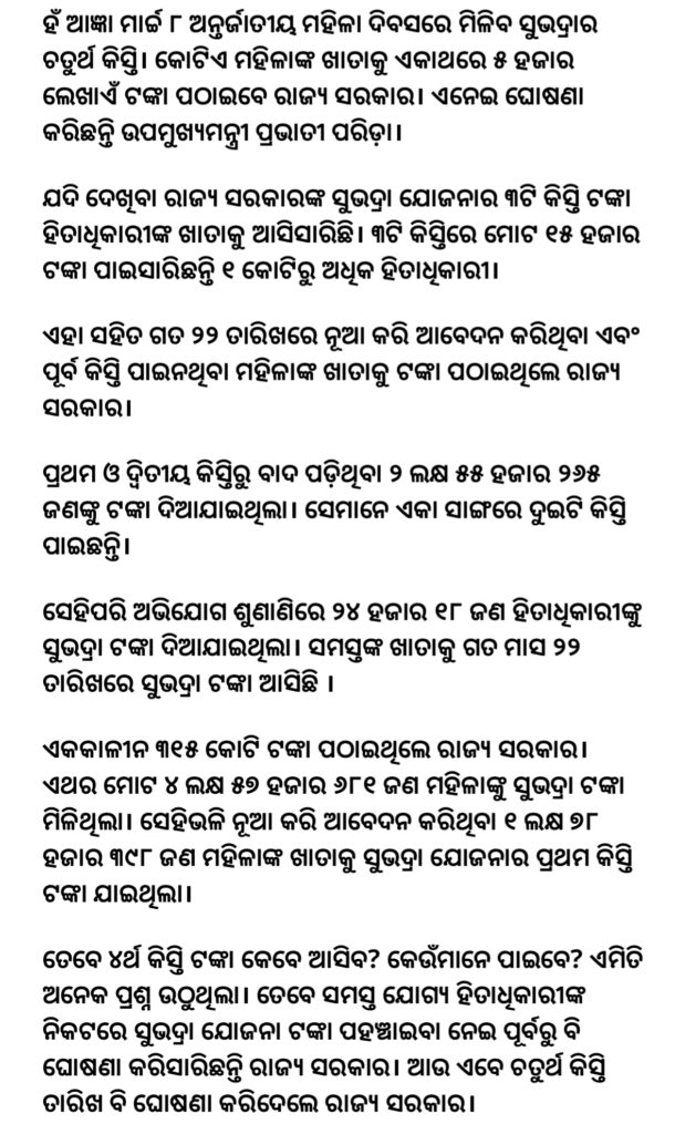 Yes, the fourth installment of Subhadra will be available on March 8, International Women’s Day. The state government will send Rs 5,000 to the accounts of one crore women at a time. Deputy Chief Minister Parvathi Parida has announced this.