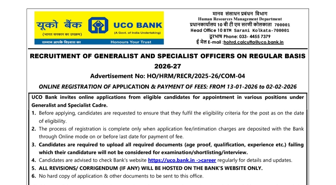 UCO Bank has released a new recruitment notification for 173 vacancies of Generalist and Specialist Officers under Advertisement No. HO/HRM/RECR/2025-26/COM-04. Eligible candidates from Odisha who have completed Graduation can apply online for this opportunity. The age limit for applicants is 20 to 35 years, and the selected candidates will receive an attractive salary ranging from ₹48,480 to ₹93,960 per month. Interested and eligible candidates must submit their applications online on or before 02 February 2026 through the official website https://uco.bank.in