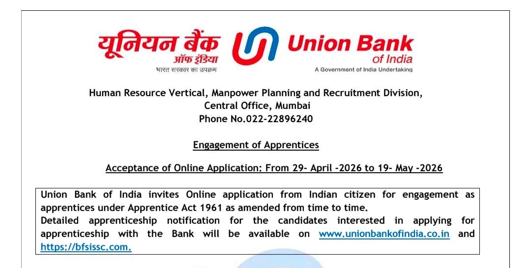 The Union Bank of India has announced the Apprentice Recruitment 2026 under the Apprentices Act, 1961, offering a total of 1865 vacancies, including 98 posts reserved for PwD candidates. Among these, 58 vacancies are allocated for Odisha. Candidates from across India are eligible to apply for the Apprentice position, which comes with a training duration of one year from the date of contract. Selected candidates will receive a monthly stipend ranging from ₹15,000 for rural or semi-urban areas, ₹18,000 for urban areas, and ₹20,000 for metro cities. The selection process consists of an online test of 100 marks to be completed in 60 minutes, followed by a local language proficiency test. Interested applicants must submit their applications online through the BFSI SSC portal by visiting the official website.