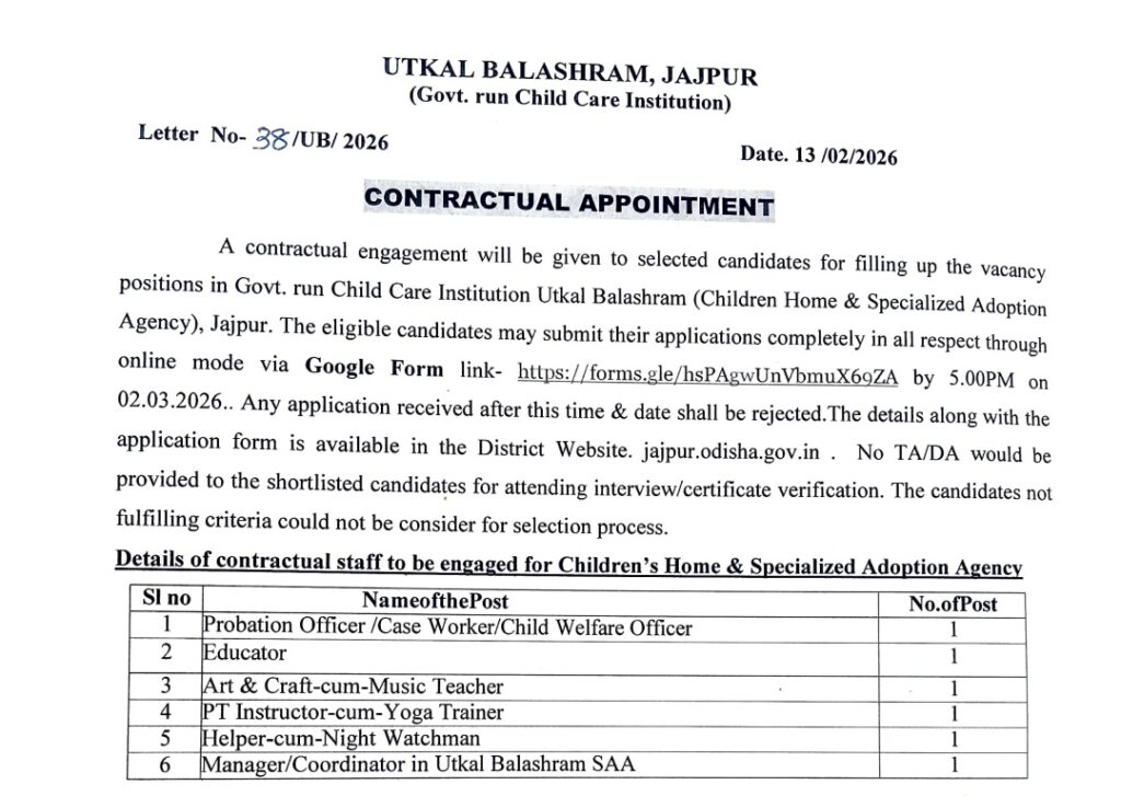 Utkal Balashram, Jajpur District has released a recruitment notification for 06 contractual posts under Advertisement No. 38/UB/2026. Candidates belonging to Odisha state are eligible to apply. The minimum educational qualification ranges from 8th pass to Graduate level, depending on the post. The age limit is 21 to 45 years as on 15-02-2026. Selected candidates will receive a monthly salary between ₹7,944 to ₹23,170. The selection process will be based on interview. Interested and eligible candidates must apply online on or before 02-03-2026 through the official website https://jajpur.odisha.gov.in. This is a contract-based government job opportunity, and eligible candidates are advised to apply as early as possible.