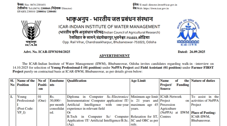 The Indian Institute of Water Management (ICAR IIWM) has announced the Water Department Recruitment 2025 for various positions. This is a great opportunity for candidates seeking a permanent government job in Odisha. The recruitment is for the posts of Young Professional-I and Field Assistant. The selection will be done through a walk-in-interview, and all eligible candidates from Odisha can apply. Both male and female candidates are encouraged to participate. The place of posting will be within Odisha, offering stable and rewarding career prospects in the water management sector. Interested candidates must attend the walk-in-interview before the last date, 14th October 2025. Don’t miss this chance to join ICAR IIWM and contribute to sustainable water resource management in the state.