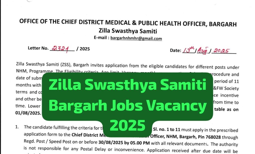 Zilla Swasthya Samiti, Bargarh has released an official notification for the recruitment of 23 various vacancies under different programs. This is a great opportunity for candidates across Odisha who are looking to build their career in the health sector. The recruitment will be conducted through an interview-based selection process, and no application fee has been mentioned in the notification. Interested and eligible candidates belonging to Odisha can apply for these posts by submitting their application in the prescribed format. The last date for submission of the application is 30th August 2025. Aspirants are advised to go through the official notification carefully before applying to ensure they meet the required eligibility criteria.