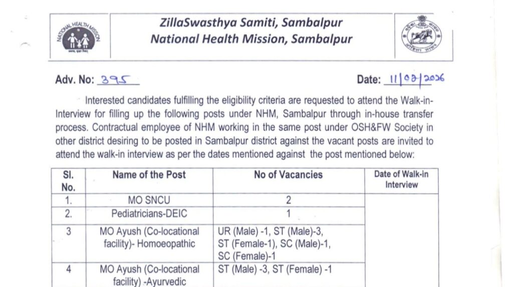 Zilla Swasthya Samiti, Sambalpur (ZSS) has released a recruitment notification for Data Assistant cum Accountant, Medical Officer (MO), and other posts to fill 33 contractual vacancies under Advt. No. 395. Candidates belonging to Odisha who possess MBBS / AYUSH / Graduate / Diploma qualifications are eligible to apply. The selection will be conducted through Walk-in Interview (offline mode). Interested and eligible candidates must attend the interview on or before 24 February 2026. For detailed information regarding eligibility, age limit, and application process, candidates are advised to visit the official website sambalpur.odisha.gov.in.
